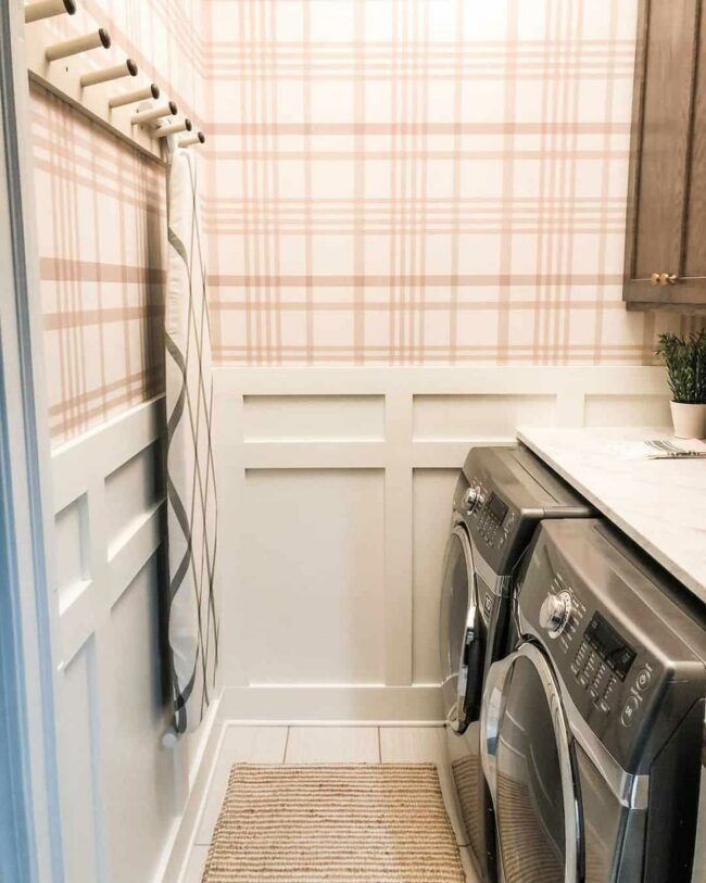 Laundry rooms spark joy with beige gingham wallpaper that radiates warmth and comfort.