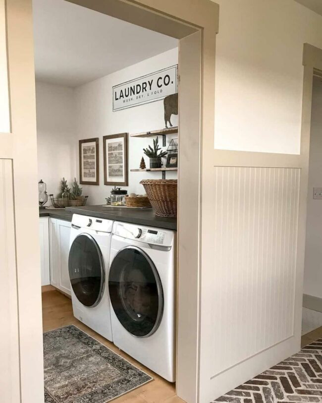 White washers and dryers stand ready for action, complemented by carefully curated decor.
