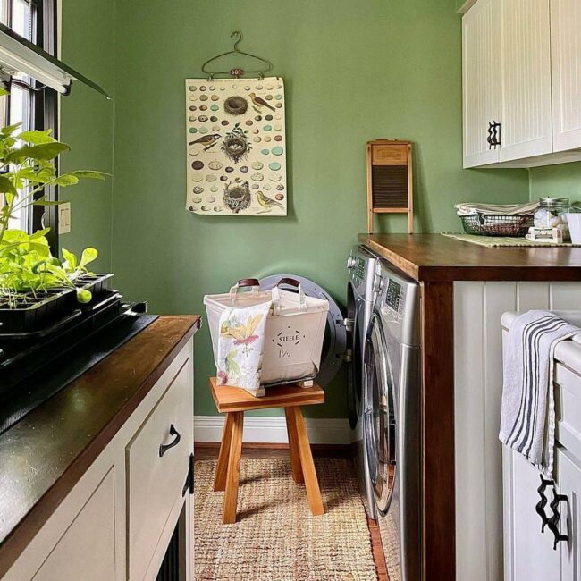 Green walls paired with white cabinets create a fresh, inviting atmosphere that instantly lifts your mood.