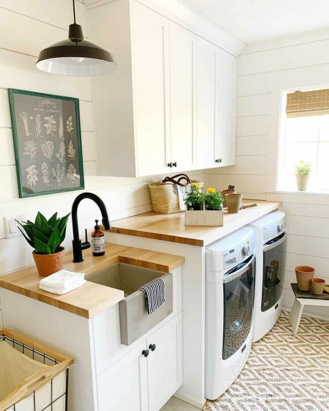 Wood countertops radiate comfort alongside crisp white cabinets in this charming laundry space.
