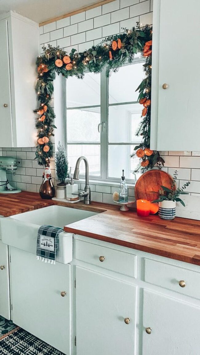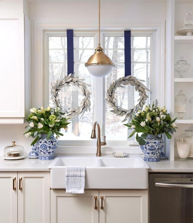 Charming wreaths adorned with deep blue ribbons grace the window, infusing gentle character into the cooking area.