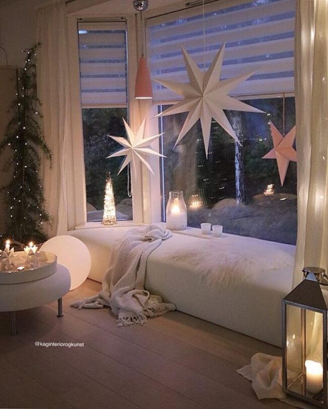 Soft white walls invite pure holiday magic while twinkling star-shaped lamps dance near frosty windows, casting enchanting shadows across the space.