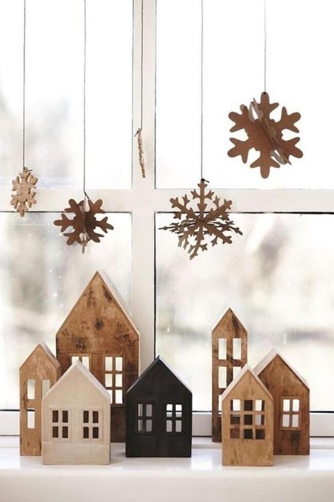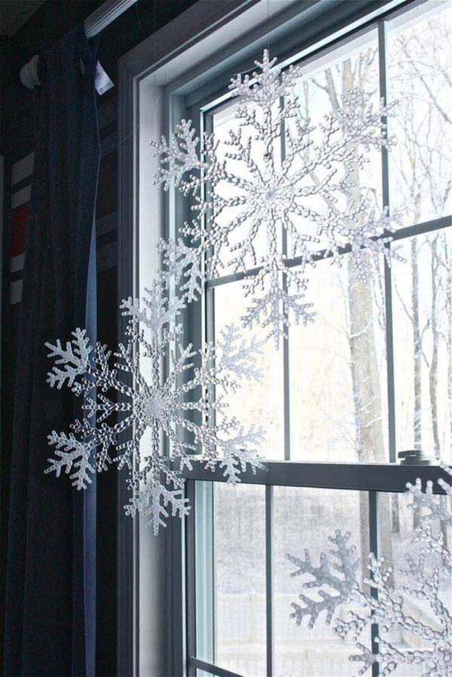 Delicate snowflake ornaments gracefully hang before crystal-clear windows, casting enchanting shadows that draw your eye instantly.