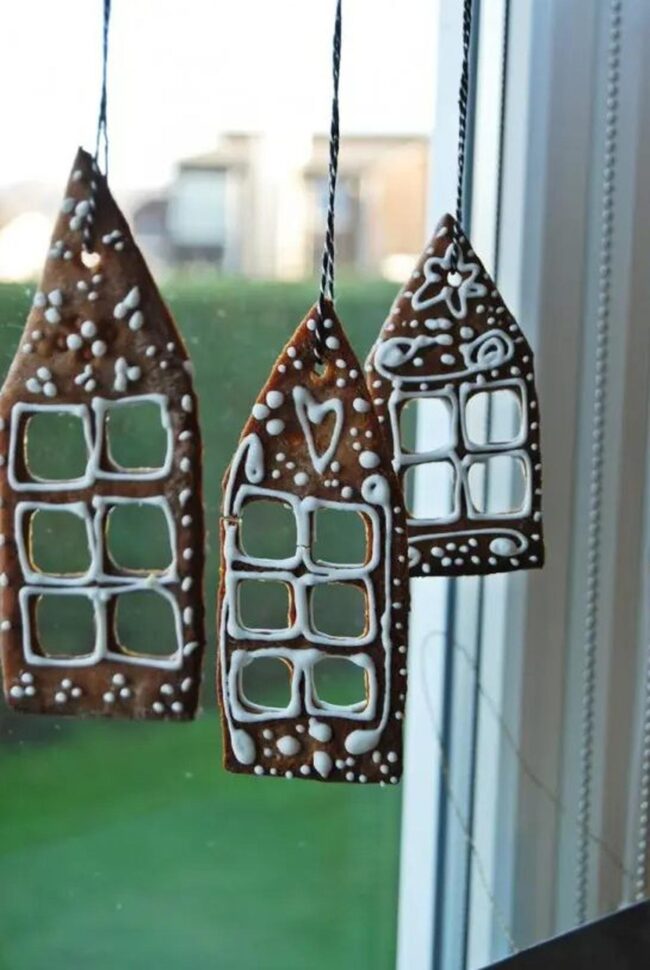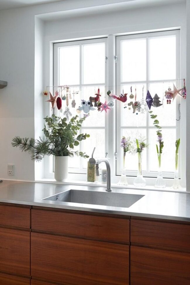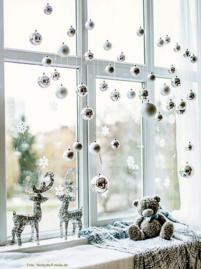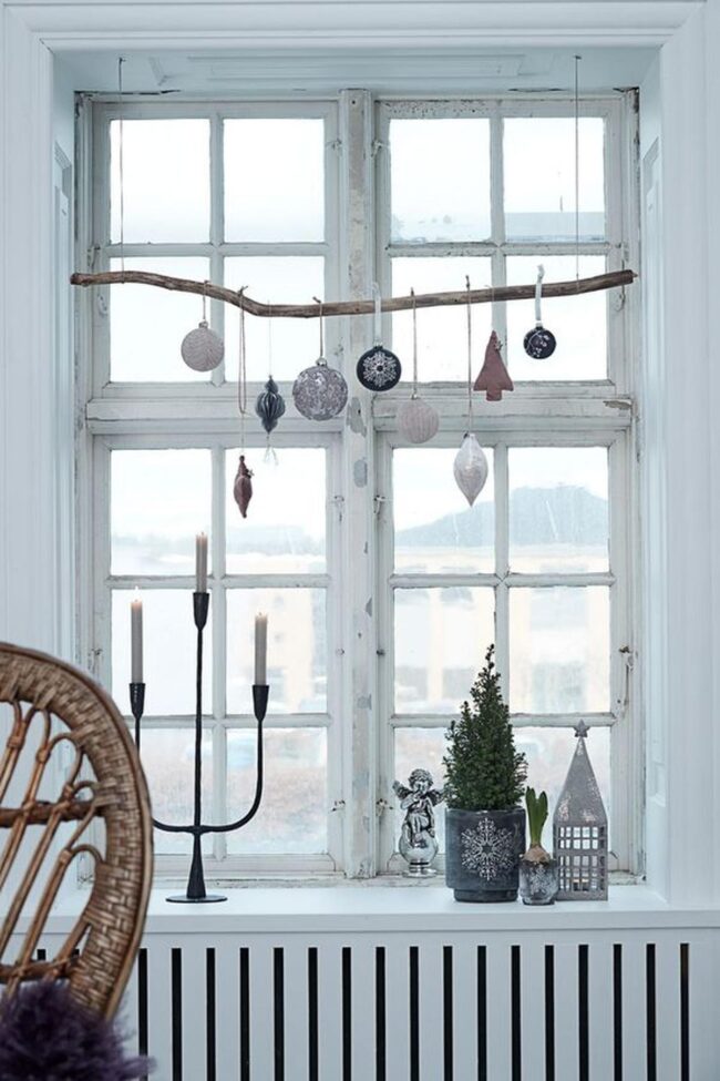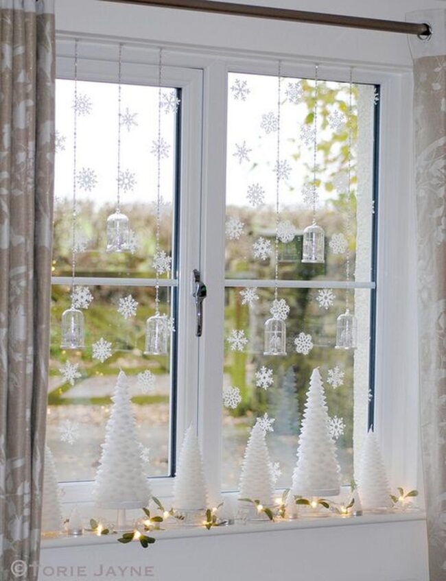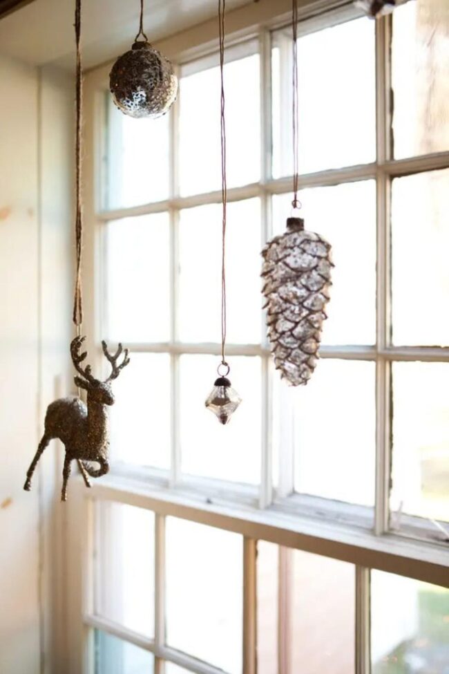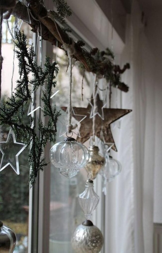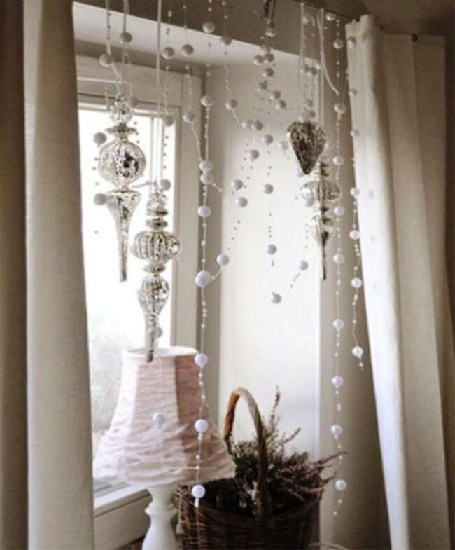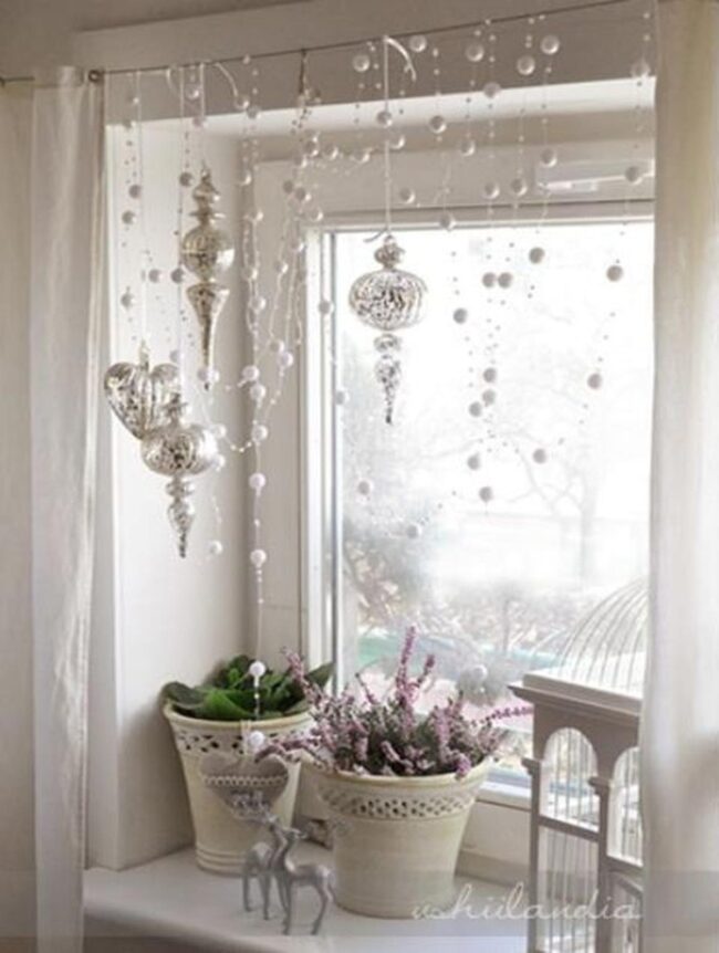 Delicate silver and white ornaments catch light beautifully, dancing from elegant strings above your windowsill.