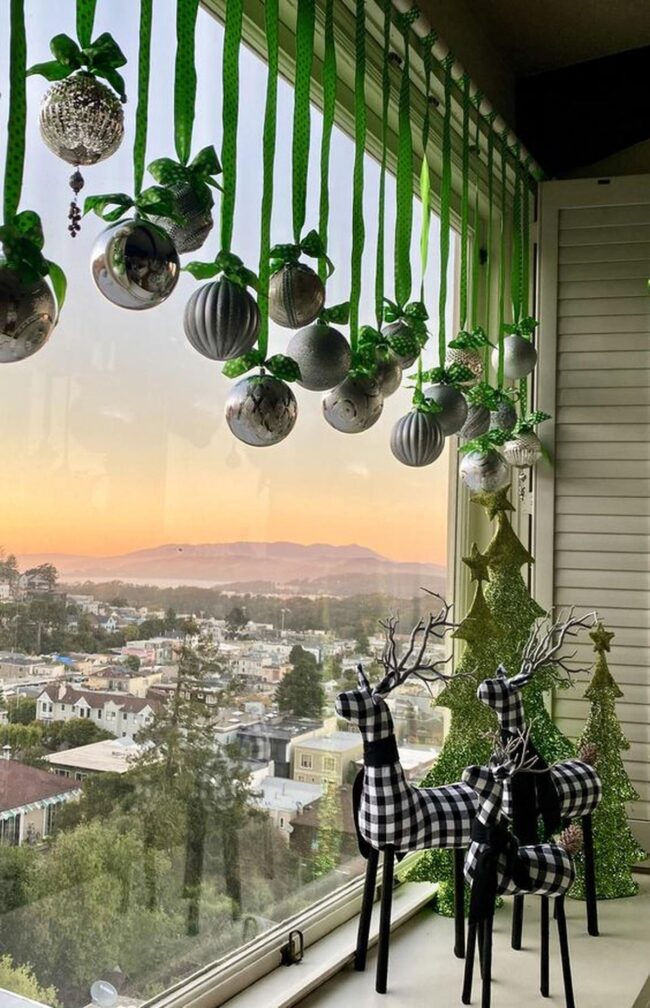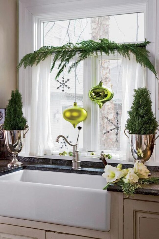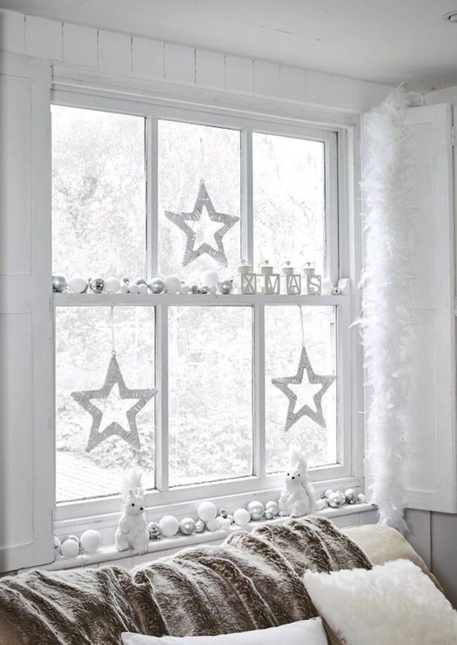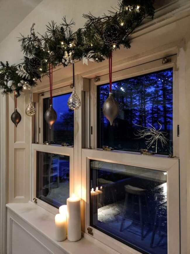 Crisp white window frames complement rich green branches, creating a stunning backdrop for sparkling silver baubles and intricate snowflake designs.