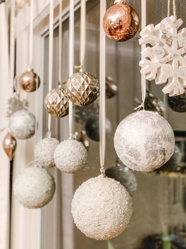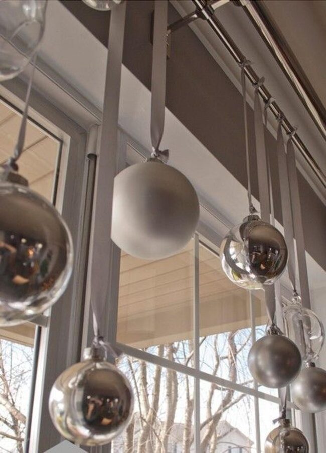 Delicate ribbons expertly suspend shimmering metallic spheres near windows, creating enchanting visual displays that catch everyone's attention.