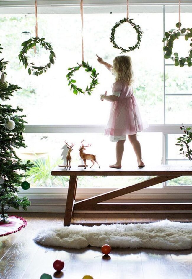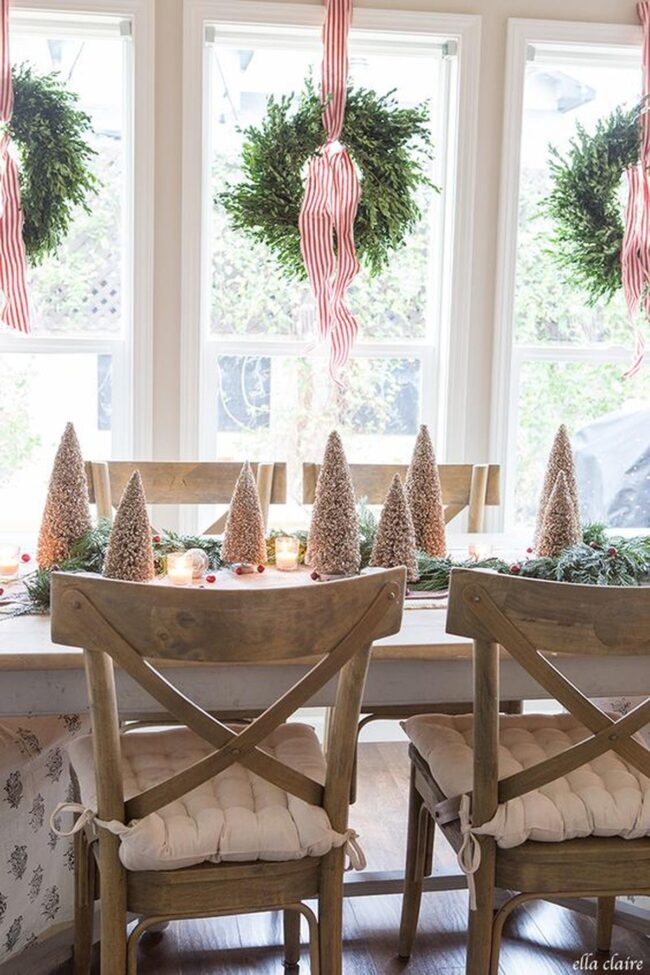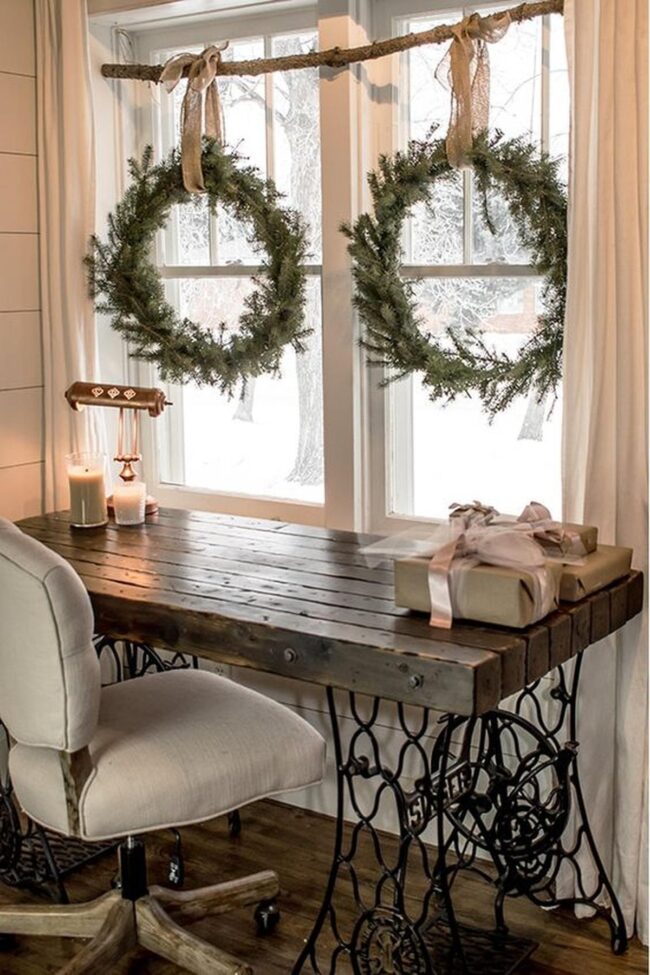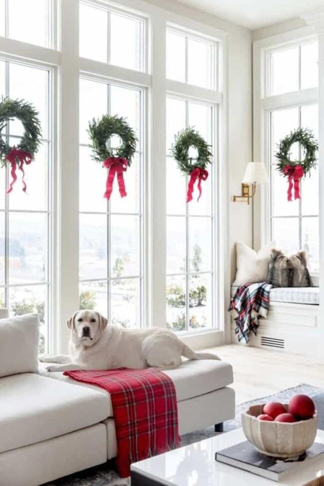 Holiday wreaths hang gracefully, bringing nature's beauty indoors with elegant simplicity.