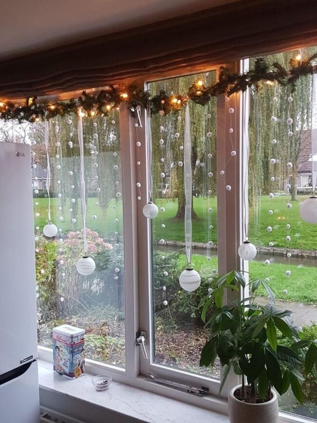 Soft white spheres dancing near glass windows create an enchanting atmosphere that whispers elegance without shouting.