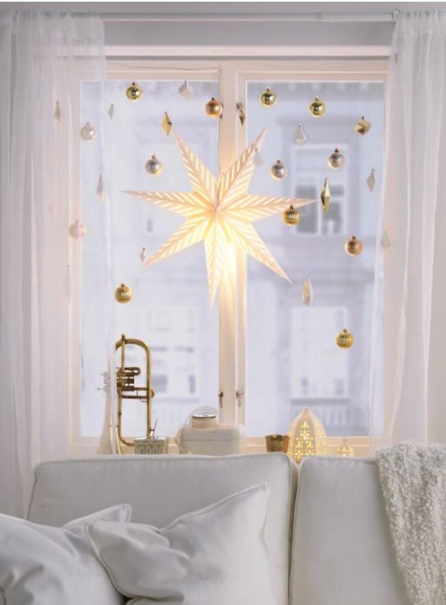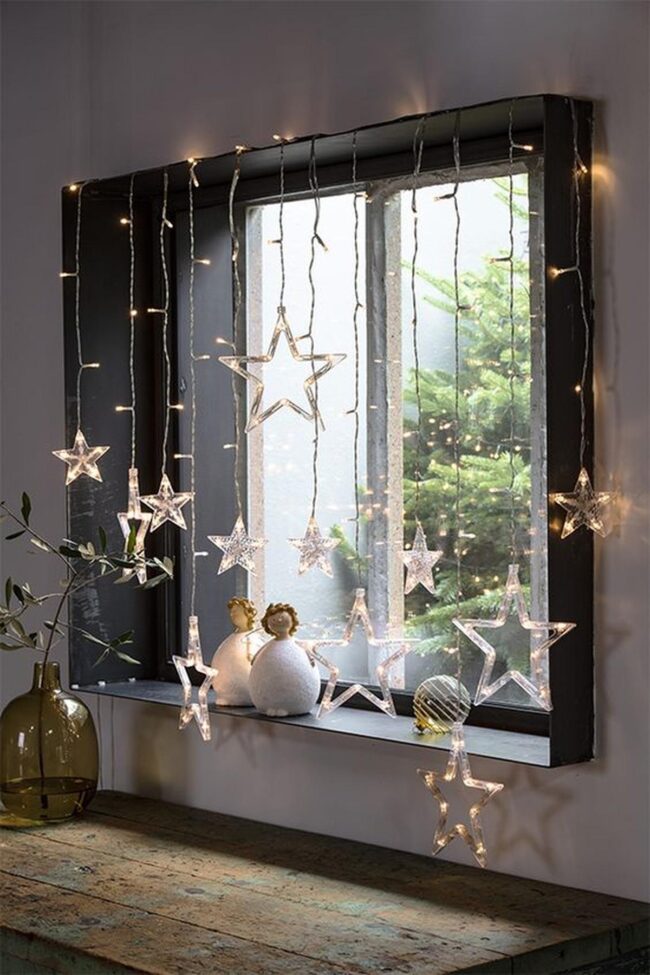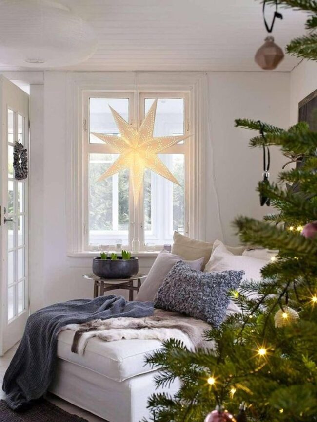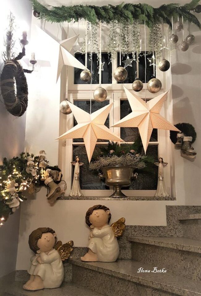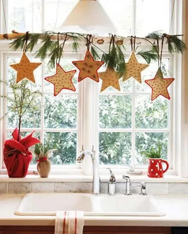 Delicate paper stars dangle near windows, casting enchanting light patterns across wooden surfaces.