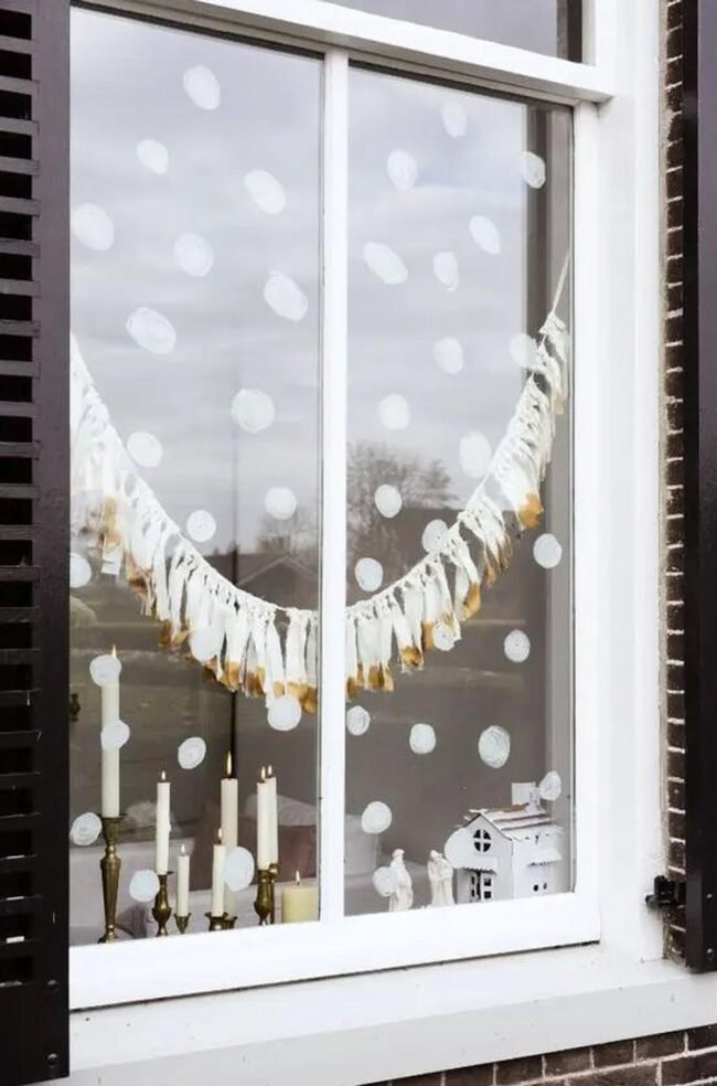 Delicate white snowflake cutouts scatter winter wonder across the glass, casting gentle shadows and spreading seasonal cheer.