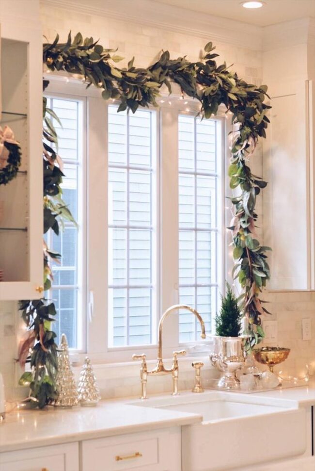 Green garlands laced with soft glowing bulbs create a cheerful frame that pulls your gaze instantly.