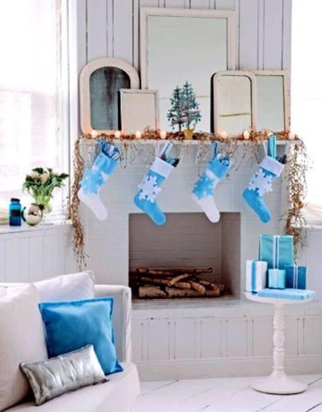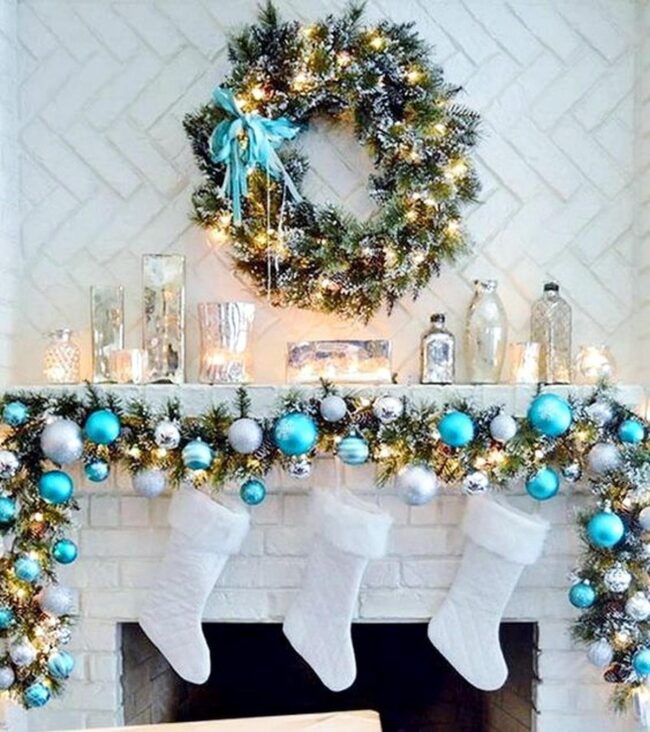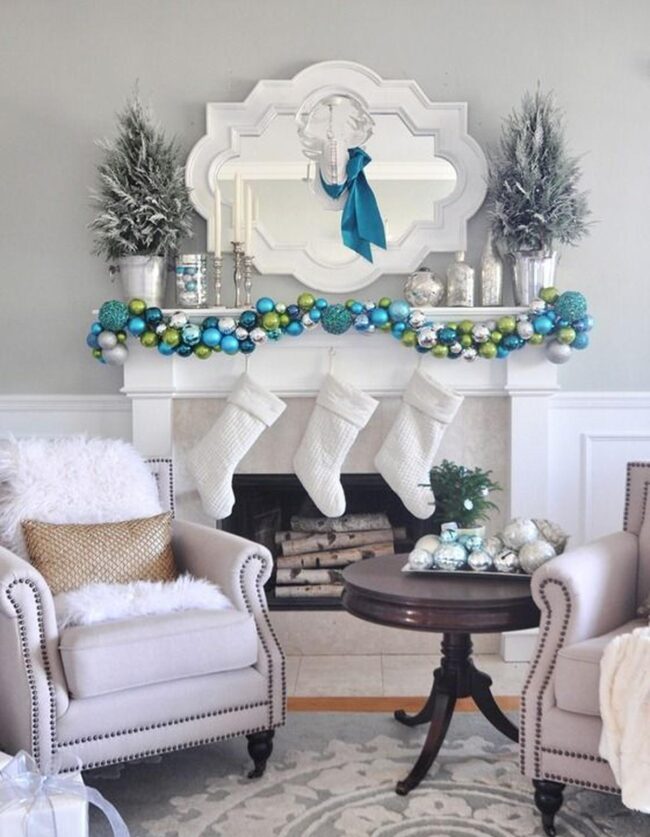 Blue, green, and silver ornaments dance across the fireplace mantel, sparking joyful memories of festive gatherings.
