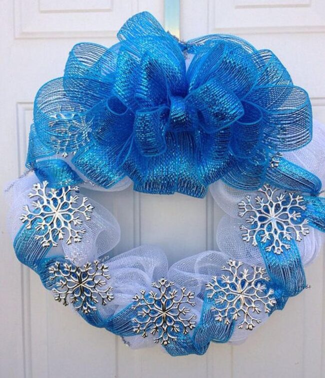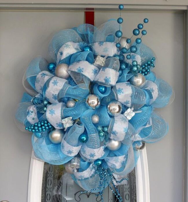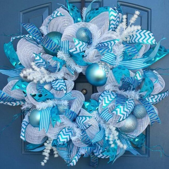 Holiday wreaths burst with personality when blue and white ribbons dance together, catching light and eyes simultaneously.