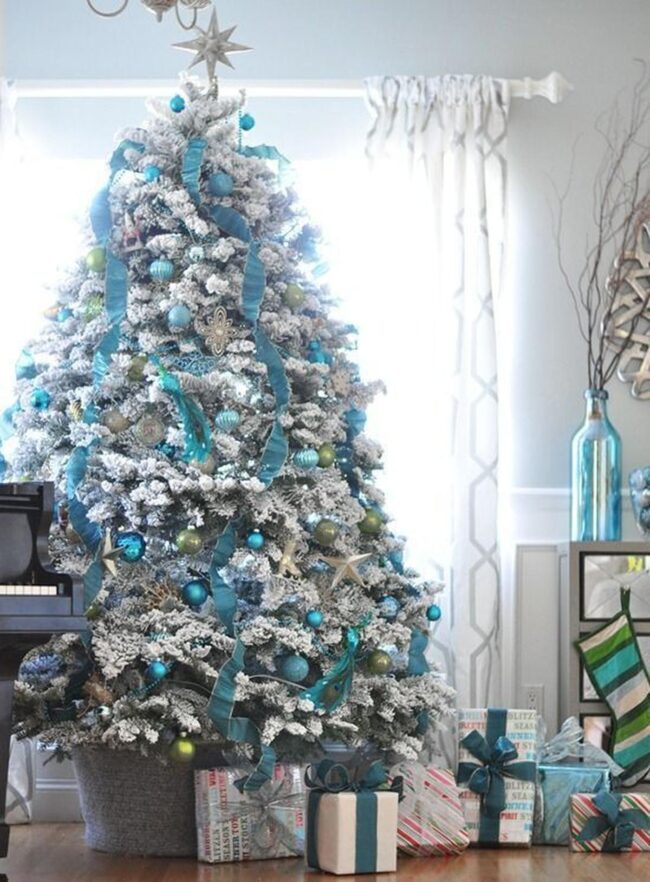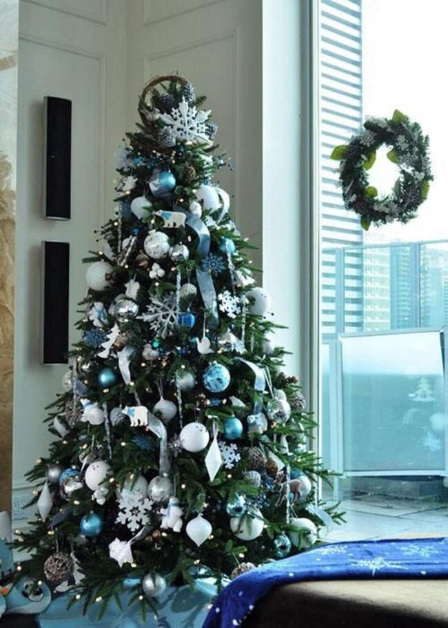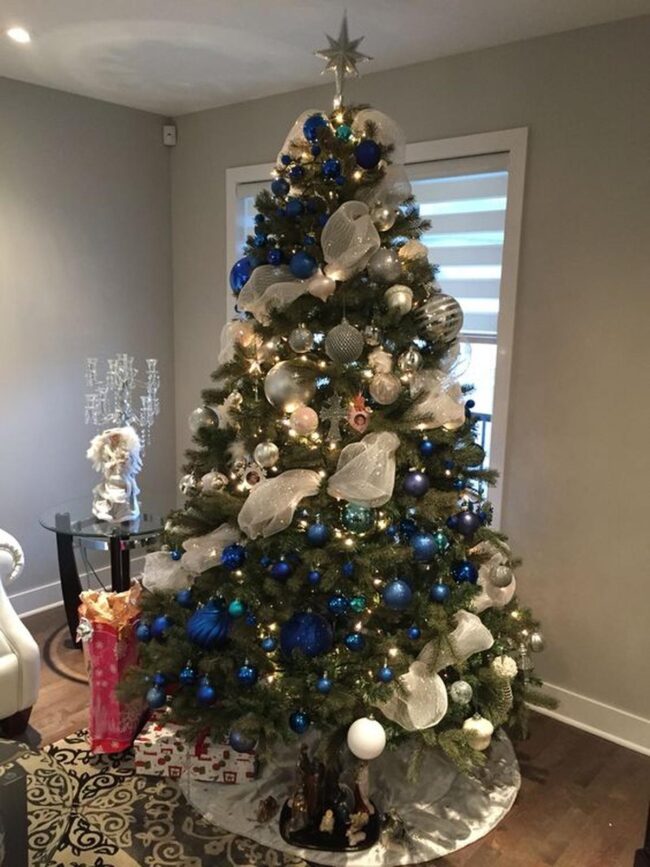 Cheerful blue and silver ornaments catch every glance, spreading joy through their delightful shimmer and elegant placement.