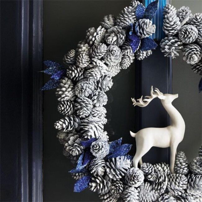 Delicate pine cones sprinkled with soft white powder blend seamlessly with shimmering decorations, creating a woodland wonderland right at your front door.