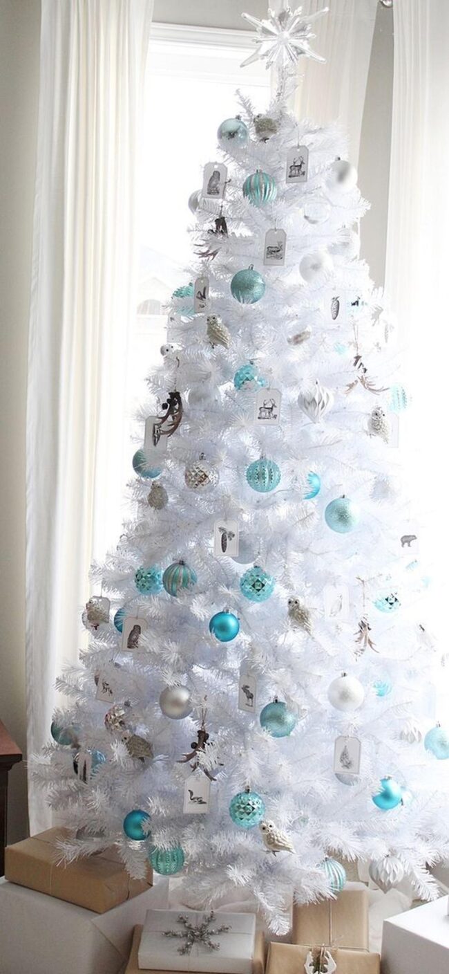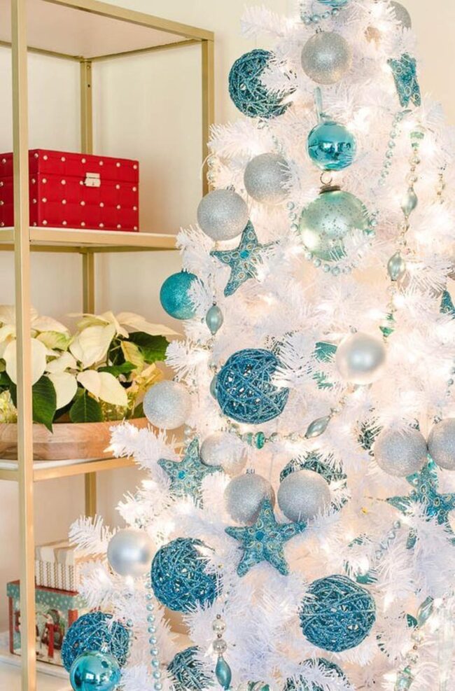 White Christmas trees adorned with sparkling blue and silver ornaments become stunning focal points that draw your eyes across the room's elegant landscape.