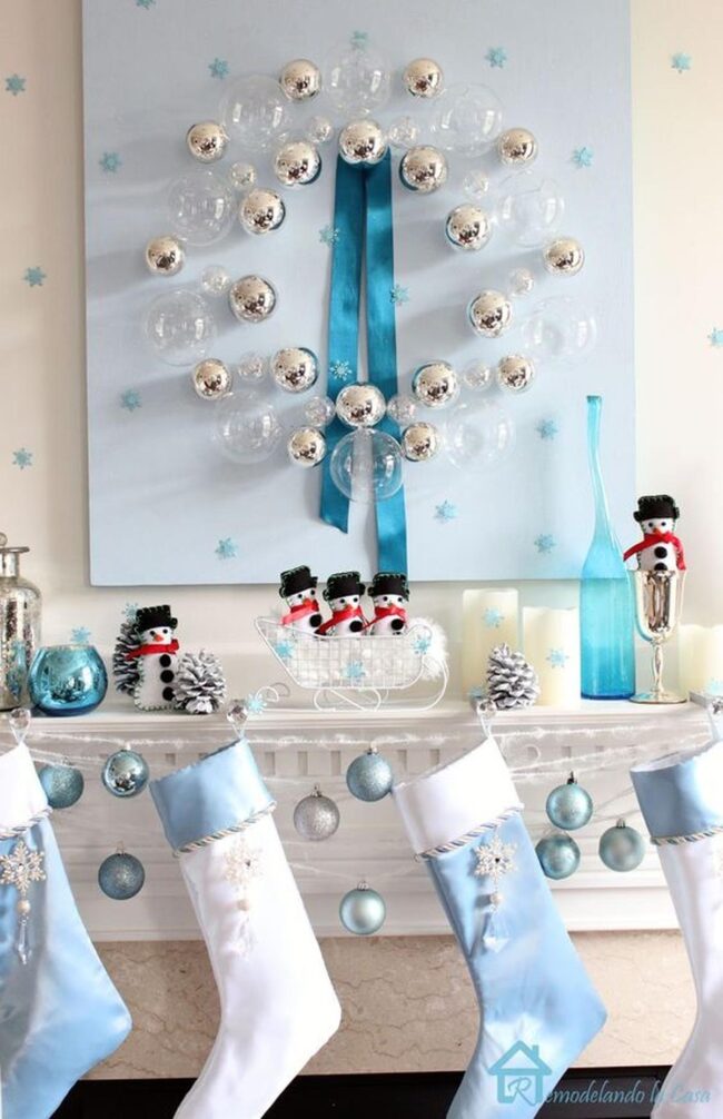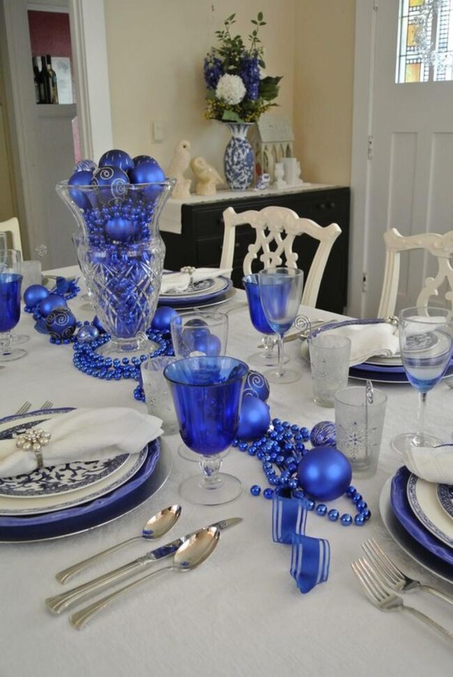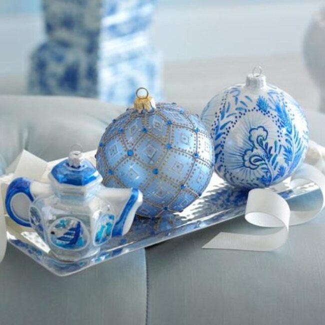 Deck out your holiday space with a stunning blue and white ornament display that whispers winter magic.