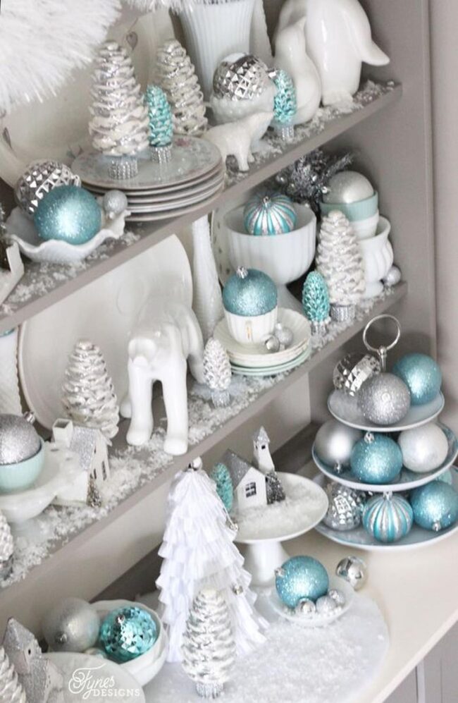 Silver and blue ornaments dance across shelves, casting magical sparkles that instantly draw your eye into a winter wonderland.