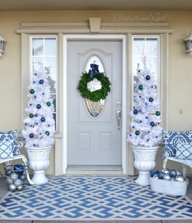 White and cool blue tones contrast beautifully against dark doors, making your entrance feel instantly festive and welcoming.