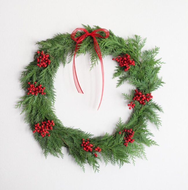 Lush green branches weave together in a circular dance, creating a stunning canvas for bright red berries that pop like cheerful ornaments.