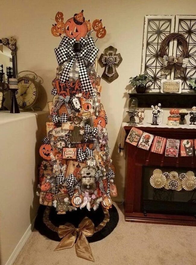 Pumpkin-adorned corners burst with vibrant orange decorations and charming black-and-white checkered ribbons that instantly capture attention.