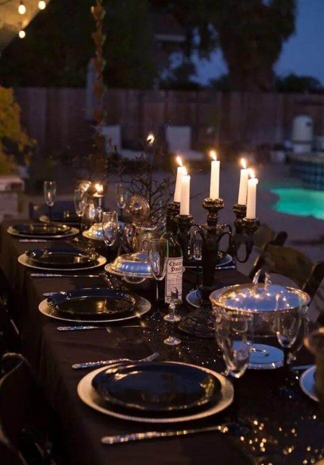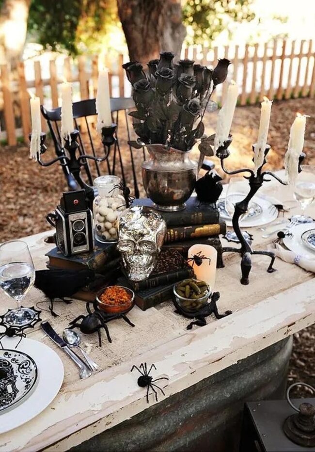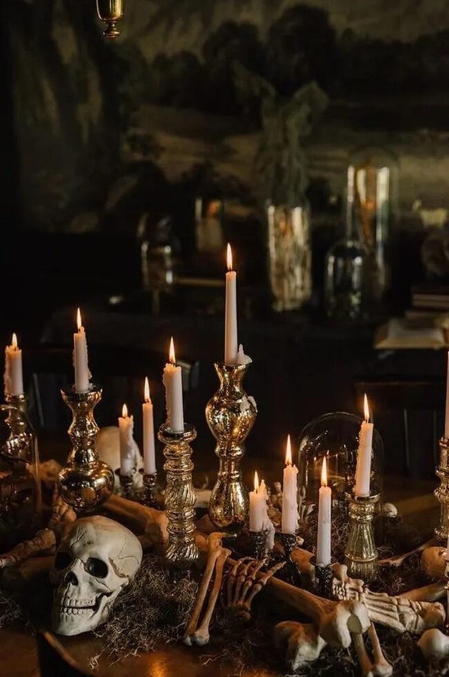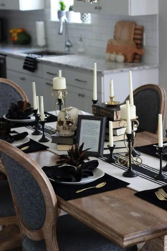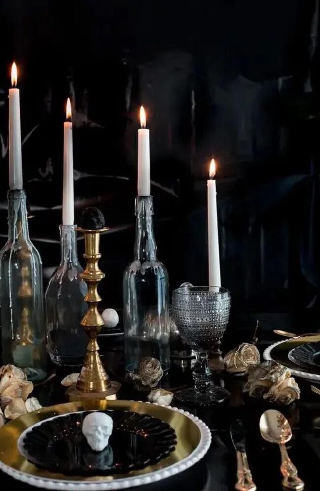Craft a mesmerizing Halloween table that sends delightful chills down your spine with dark metal candle holders casting enchanting shadows across stark white candles.