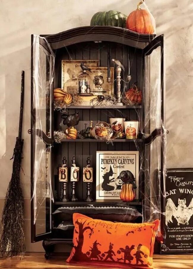 Wooden floors ground the display with natural richness, adding depth and character to the room's Halloween spirit.