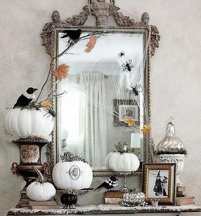 Black spiders crawling gracefully across ornate mirrors create delightful surprises, while shimmering silver gourds add unexpected metallic sparkles against natural backgrounds.
