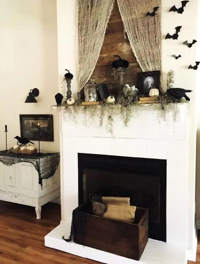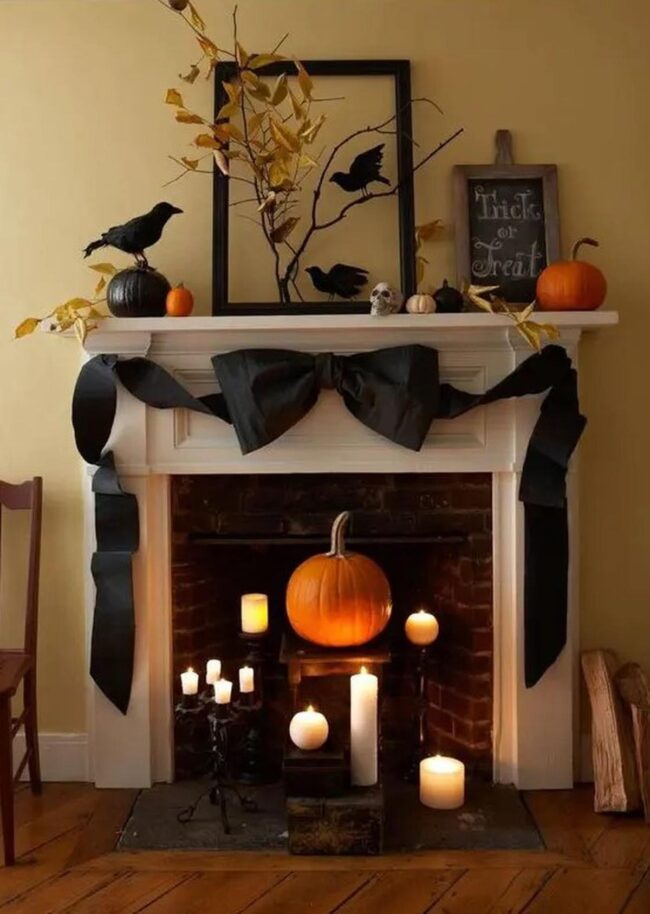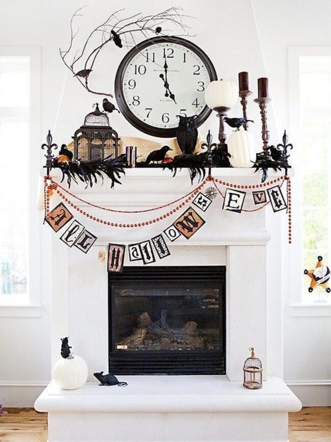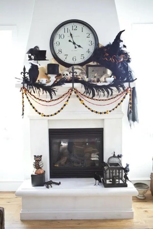 Halloween magic springs to life on a pristine white fireplace where black and orange bead garlands dance gracefully across the mantel.