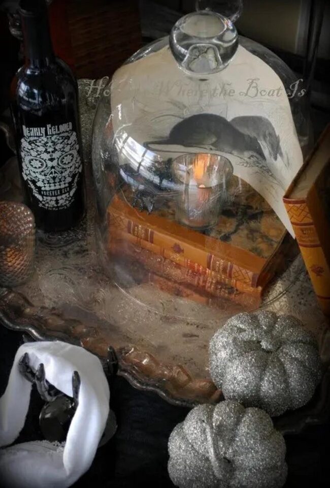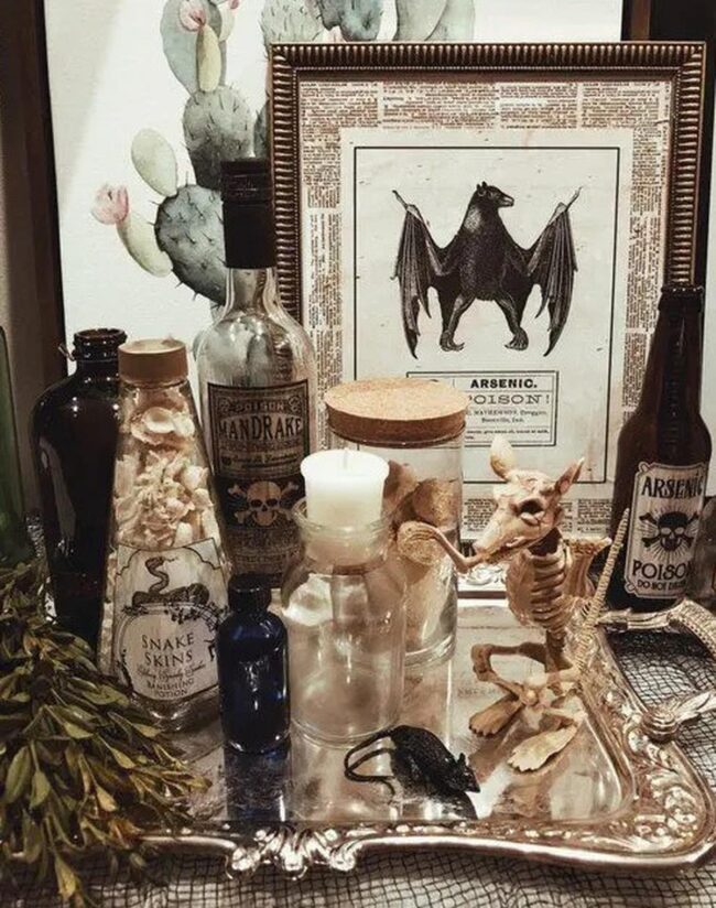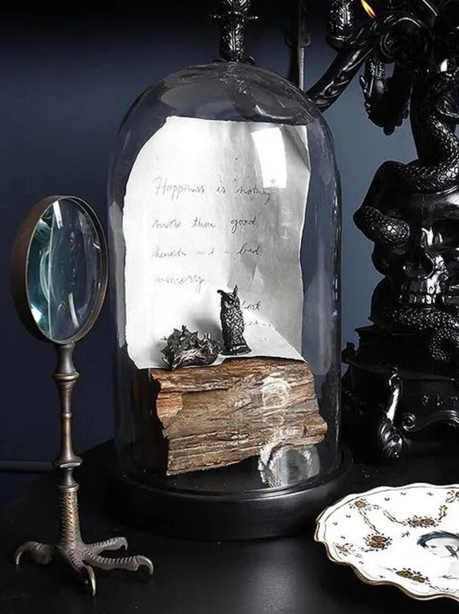 Vintage books strategically placed underneath add unexpected intrigue and depth to your dramatic display, while quirky ceramic spiders peeking from unexpected corners bring playful surprise to the scene.