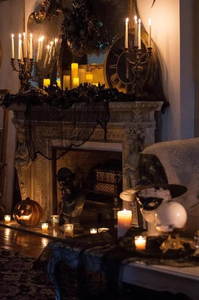 Softly draped fabric in muted tones completes the scene, inviting you to experience a sophisticated yet slightly mysterious Halloween environment that feels both sophisticated and subtly spine-tingling.