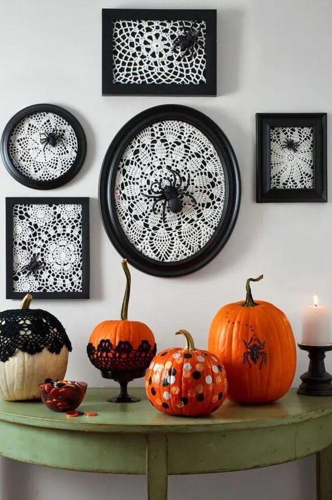White crocheted doilies framed dramatically showcase charming plastic arachnids, adding whimsical personality to walls and surfaces.