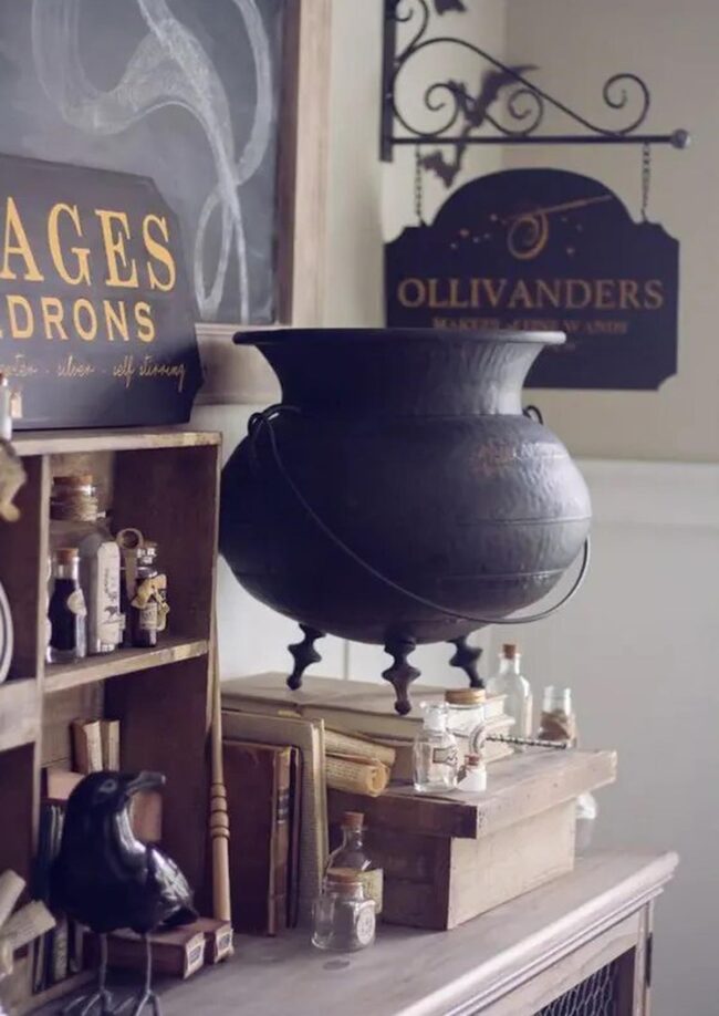 Wooden boxes strategically support the central cauldron, adding depth and character to the magical atmosphere.