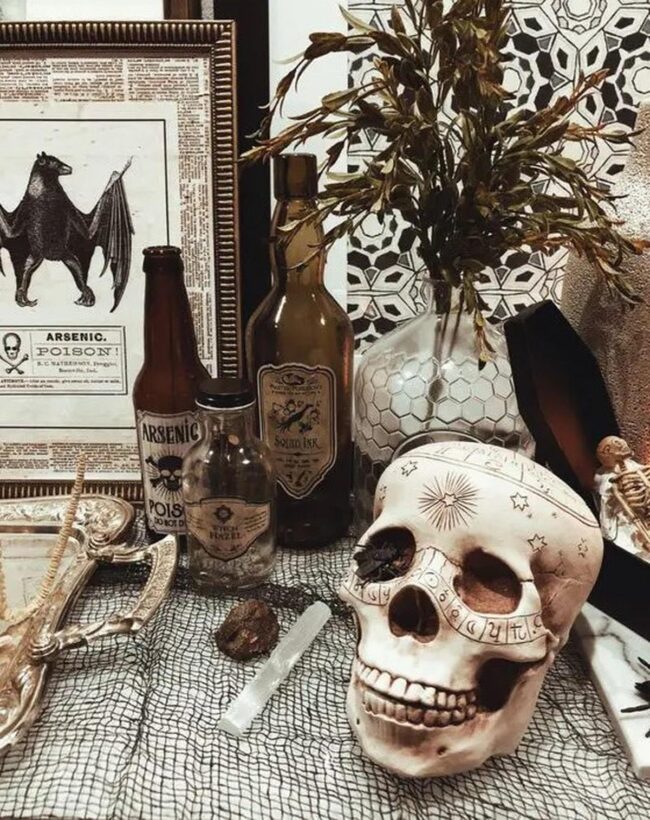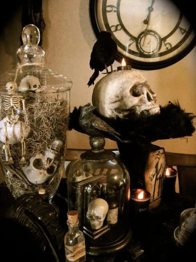 Unexpected details like glass containers filled with peculiar objects and strategically placed skeletal elements spark conversations and intrigue.