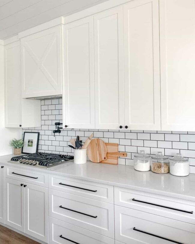 Black hardware pops against pristine white cabinets, creating dramatic visual interest in this kitchen design.