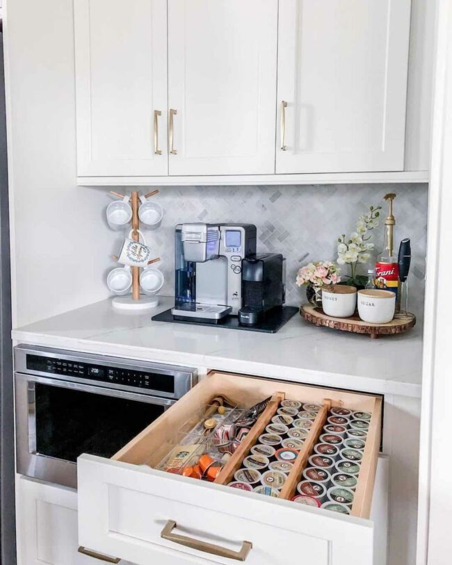 Wooden drawer dividers create perfect order for pods and accessories, ensuring everything stays tidy and accessible.
