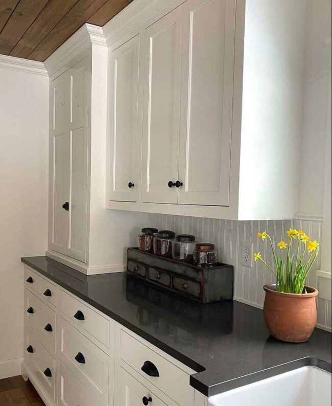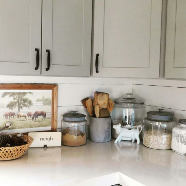 White cabinetry and rich brown granite create a perfect backdrop for this farmhouse-inspired display.
