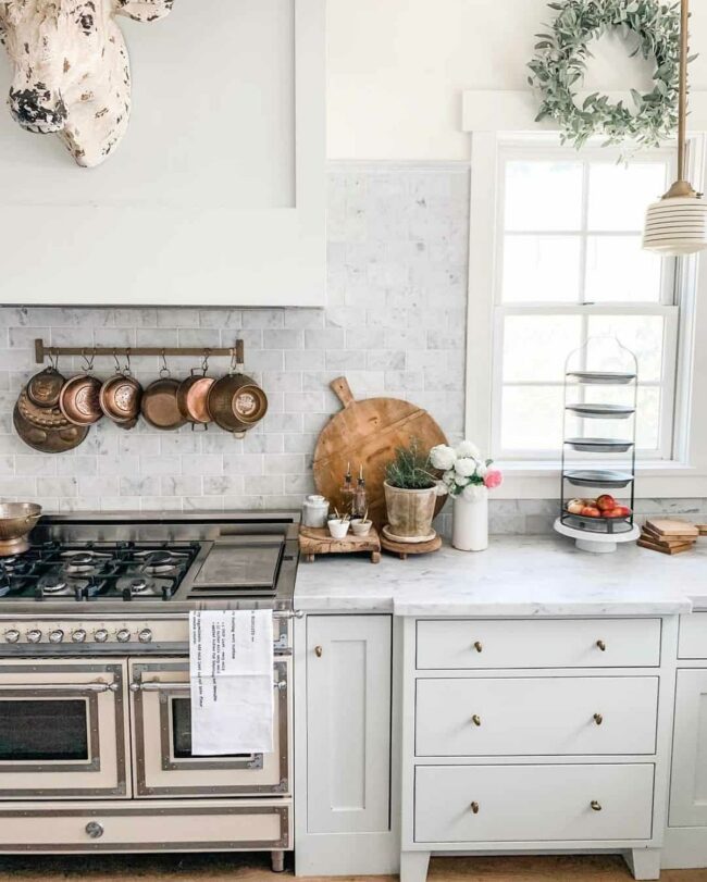 Copper elements like hanging pots and gleaming utensils add sophisticated charm and homey comfort.