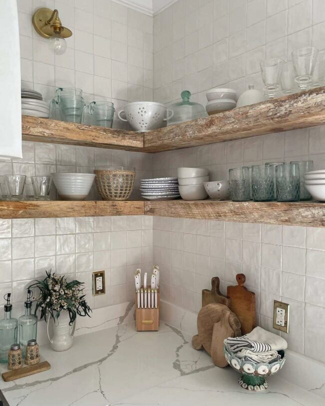 Rustic wooden kitchen corner shelves elevate cooking spaces with natural warmth and genuine character.