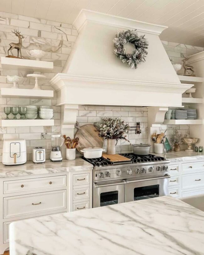 Marble countertops provide elegant sophistication underneath the shelving, while glossy white tiles add a contemporary backdrop to this charming scene.