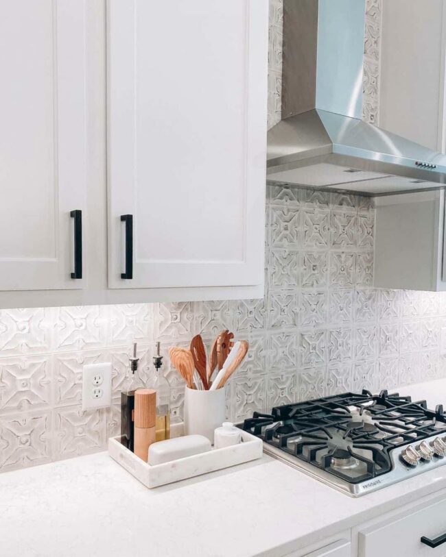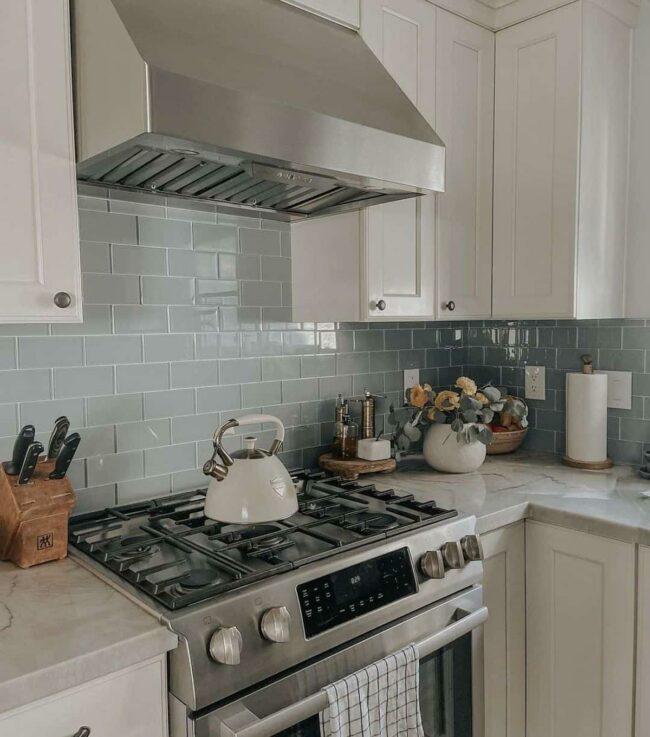 Gray tile backsplash adds contemporary sophistication, offering a cool neutral background that elevates the entire room's aesthetic.