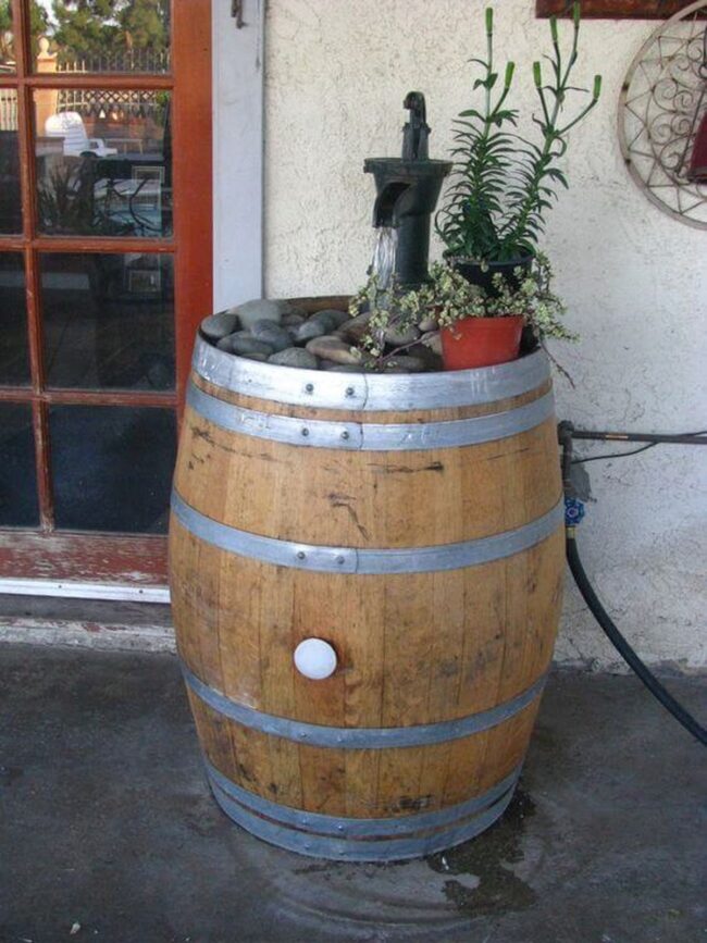 Surrounding stone-filled barrels provide aesthetic stability while offering delightful opportunities for strategic plant placement around the water feature.