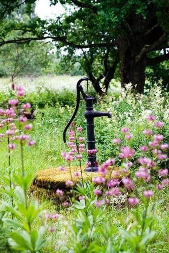 Rustic hand pumps stand as magical garden centerpieces, capturing attention with their vintage charm and nostalgic appeal.