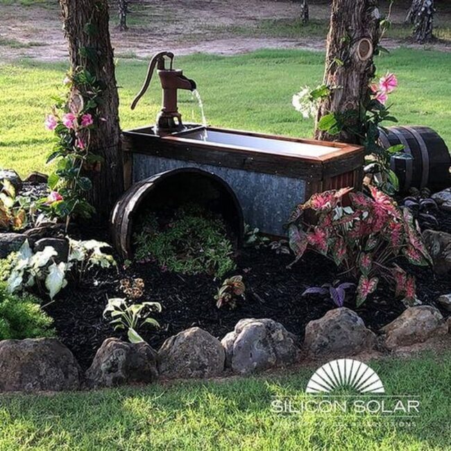 Select weathered wooden barrels to complement the pump's rustic character, allowing native plants to frame and soften surrounding edges.