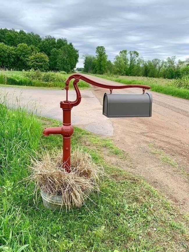 Hand pumps repurposed as mailboxes create delightful garden focal points that spark fascination and nostalgia.