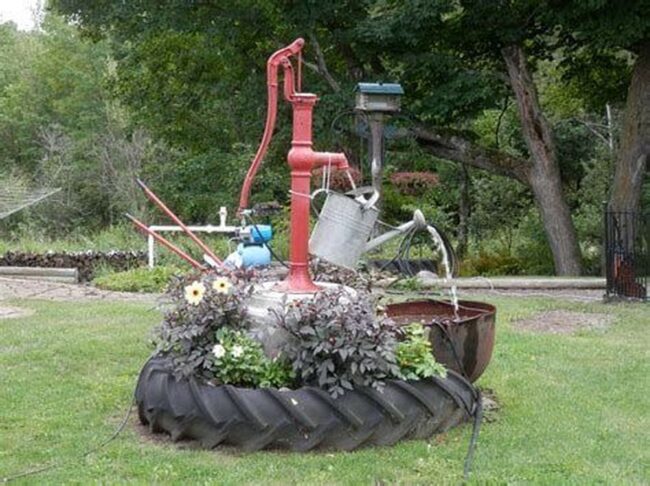 Carefully positioned tires help define garden boundaries while providing an unexpected platform for the antique pump.