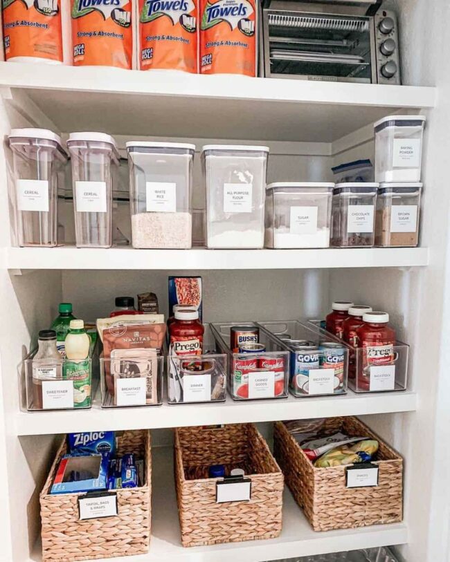 Clear bins and wicker baskets showcase your food items with style and ease.
