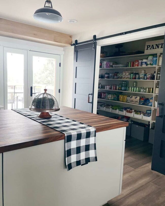 Sliding barn doors reveal a spacious pantry, creating visual intrigue and maximizing storage potential.