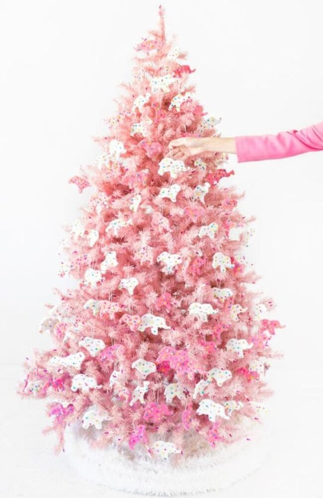 Pink Christmas tree magic bursts with unexpected charm, inviting unicorn ornaments dancing across rainbow-colored branches that spark instant delight.