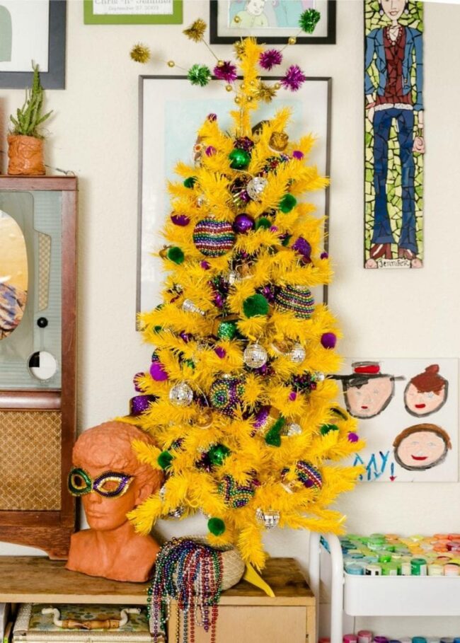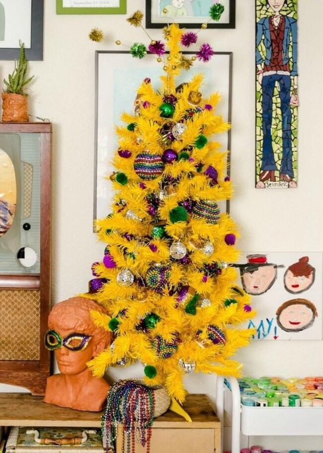 Yellow branches sprout from a Christmas tree, turning the corner into a magical spot that instantly draws your eye with its playful mix of green, purple, and silver ornaments.